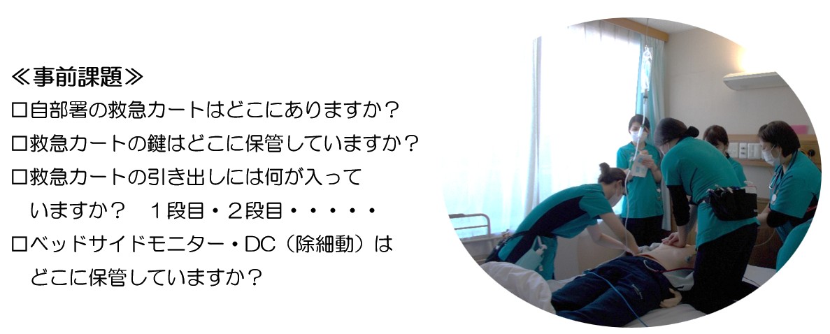 ❖当日は、発見者は新人さん、応援者・リーダー・医師役は先輩ナースが担当しシナリオを基に実施しました。(もちろん、初めは先輩か見本を見せでからの実施です)