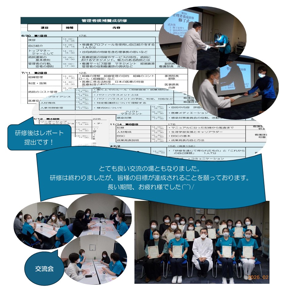 役職は、副主任~副看護部長までと幅広く、最後の成果発表では、研修前の管理者としての自分の目標をたて発表。研修を受けて後、新たな目標を設定し、目標達成の為に自分に足りないもの、そこからどのようにして目標達成するのかを具体策として発表しました。研修の内容が活かされた、とてもいい発表でした。最後には各病院の看護部長より、貴重なお言葉を頂きました。