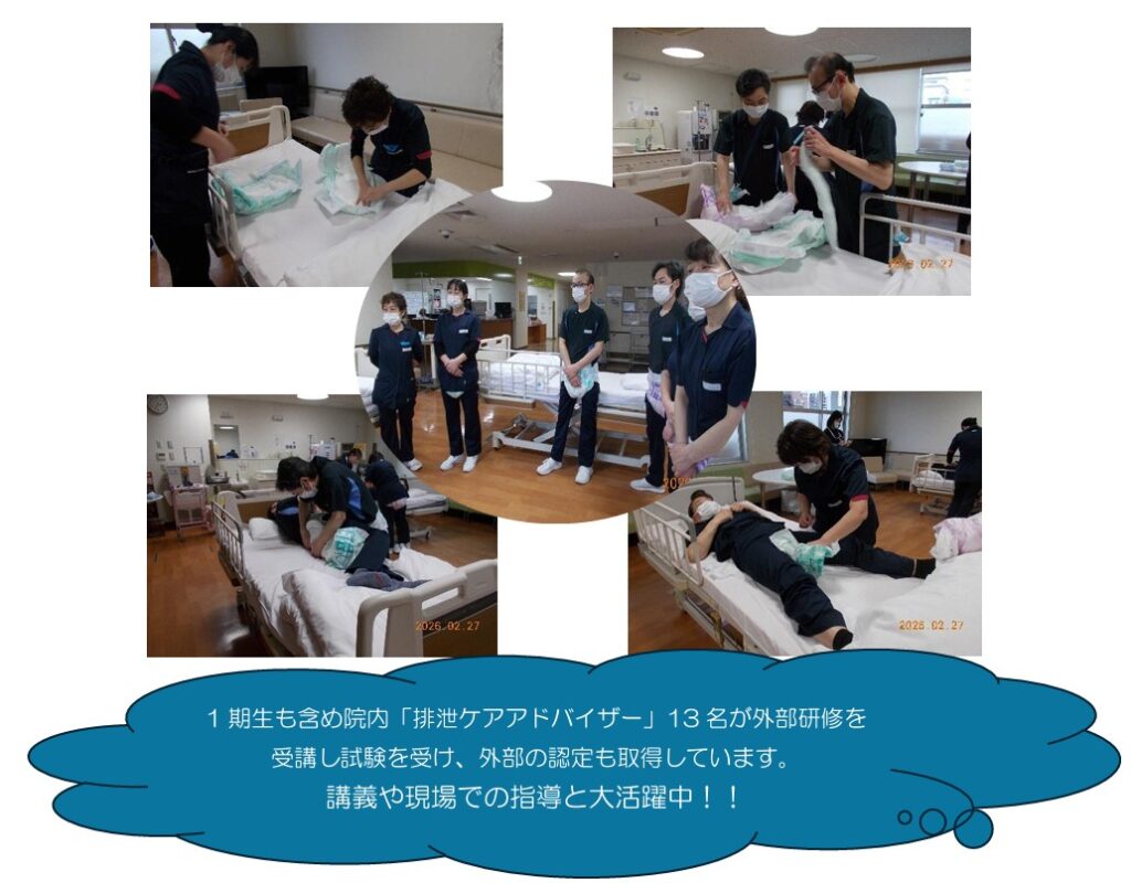 院内認定「排泄ケアアドバイザー」取得者7名は、外部が実施している「オムツの選び方・当て方」の研修を受講し、筆記と実技の試験が終了しました。