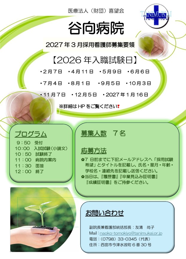 2026年1月6日 / 最終更新日 : 2026年1月6日 tanimukai 2027年3月採用看護師募集要領 【お問い合わせ】副院長兼法人統括看護部長:友清 尚子Mail:naoko-tomokiyo@tanimukai.or.jp電話:0798-33-0345住所:西宮市今津水波町6番30号